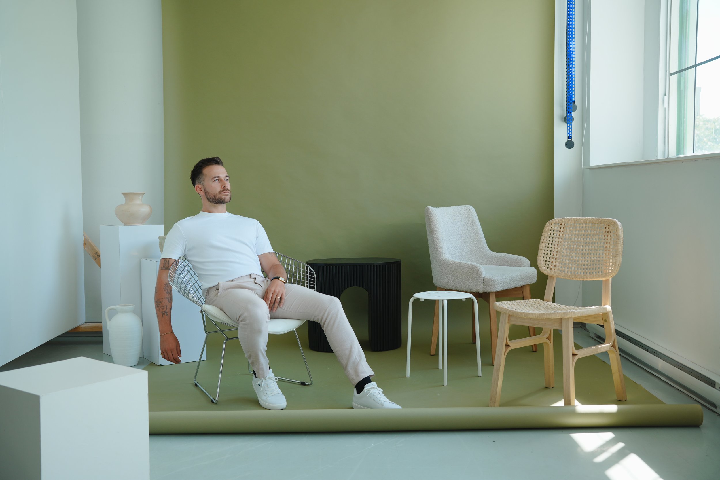 Des chaises d’accent, un fauteuil, un sofa avec méridienne, une table à café, des cubes blanc